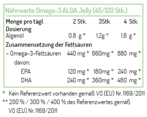 Omega-3 ALGA Jelly sind leckere Kaugeleedrops mit pflanzlichem Algenöl und Tutti-Frutti-Geschmack, die einfach vernascht werden können. Besonders passend für Kinder und ohne Zuckerzusatz. Die essentiellen Omega-3-Fettsäuren EPA und DHA in leckerer Omega-3 “Gummibärchen”-Form verpackt. Die empfohlene Tagesdosis richtet sich nach dem Gewicht, bspw. 4 Drops bei 30 kg – dies entspricht 880 mg Omega-3.