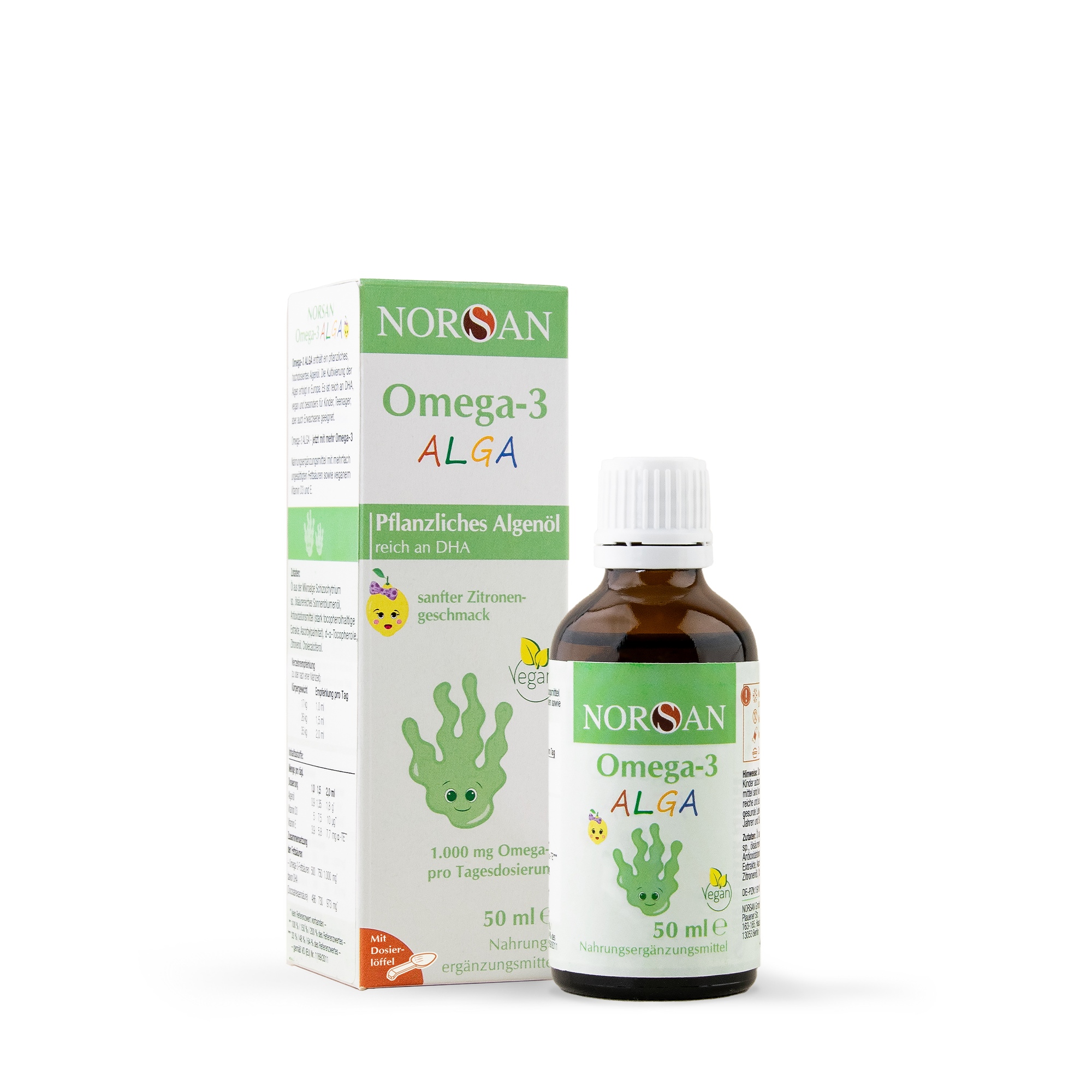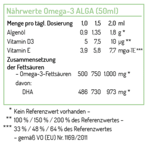 Das NORSAN Omega-3 ALGA enthält ein pflanzliches Algenöl, welches reich an der marinen Omega-3-Fettsäure DHA ist. Es wurde besonders auf die Bedürfnisse von Kindern abgestimmt und ist dank des kindgerechten Dosierlöffels leicht zu dosieren. Die empfohlene Tagesdosis (bspw. 2 ml bei 35 kg) enthält 1.000 mg Omega-3.